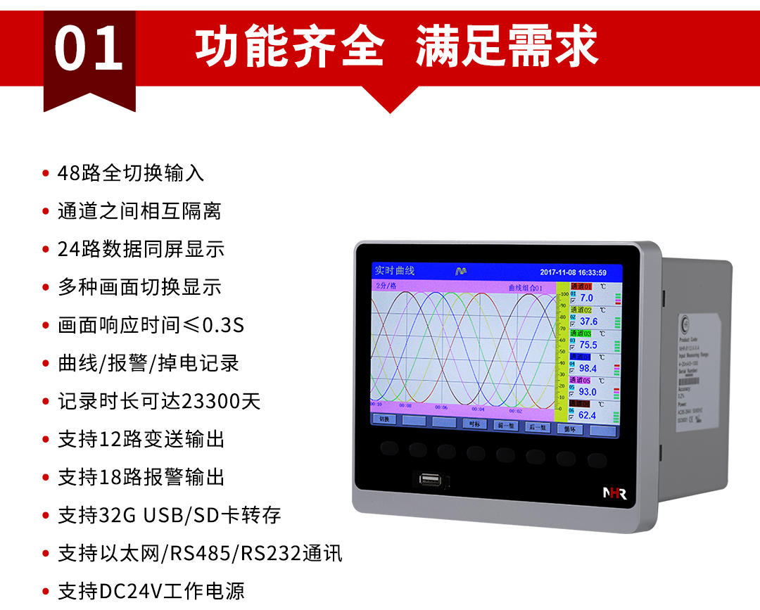 虹潤公司是專(zhuān)業(yè)生產(chǎn)無(wú)紙記錄儀的國家專(zhuān)精特新“小巨人”企業(yè)。生產(chǎn)的48路彩色無(wú)紙記錄儀,具有48路全切換輸入,數據記錄與轉存功能,配套上位機管理軟件,RS485/以太網(wǎng)通訊等特點(diǎn)。產(chǎn)品獲得無(wú)紙記錄儀、數據采集控制工作站、智能化控制器、巡回檢測顯示方法及裝置等4項國家發(fā)明專(zhuān)利;主持起草物聯(lián)網(wǎng)智能記錄儀表通用技術(shù)條件、物聯(lián)網(wǎng)智能溫度儀表通用技術(shù)條件等2項國家標準,通信系統多通道數據采集控制終端規范軍用標準,以及空間數據與信息數據傳輸系統等2項航天標準,參與國際5G標準制定;取得彩色無(wú)紙記錄儀等4項相關(guān)軟件著(zhù)作權。產(chǎn)品廣泛應用于石化、冶金、電力、制藥、新能源、農業(yè)等諸多領(lǐng)域。